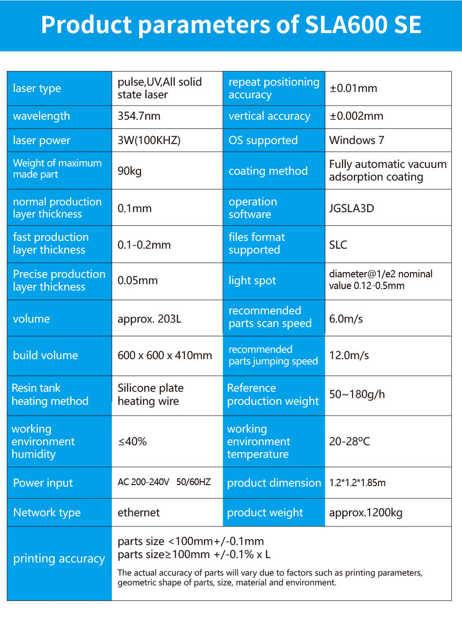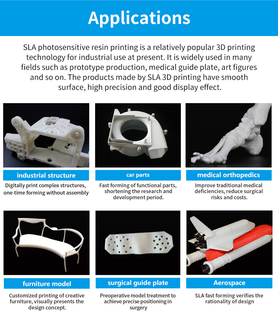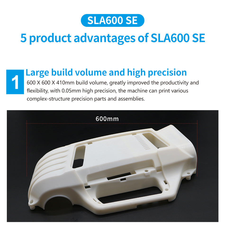 Large build size 600*600*410mm and high precision level 0.05 mm, especially used for quick prototyping of various complex precise parts and accessories used in heavy industies, such as automobile, avaition, medical orthopaedics and machinery manufacturing.
