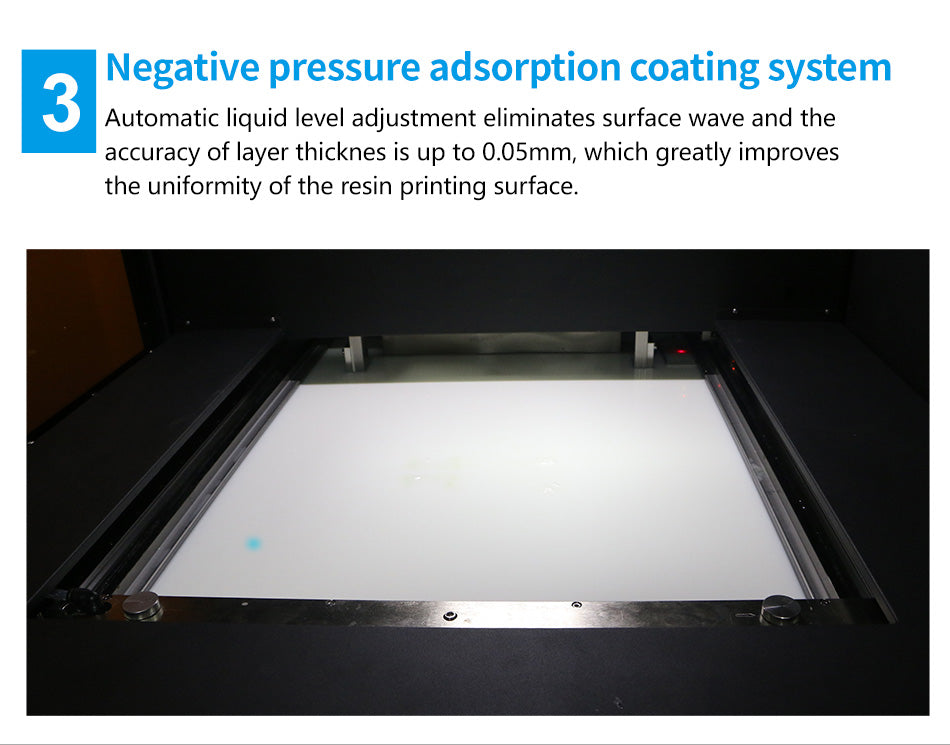 Negative pressure adsorption coating system: Automatic liquid level regulation to eliminates liquid surface fluctuation, coating thickness can be 0.05mm, high accurate and smooth printing surface.